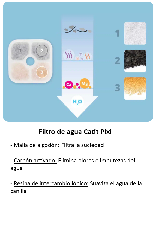 - Si compro la fuente Catit Pixi, ¿qué es lo que me voy a encontrar en la caja? Te vas a encontrar con la fuente y las partes de armado fácil, su fuente de alimentación, bomba de agua, boquilla, filtro sellado y el manual de usuario